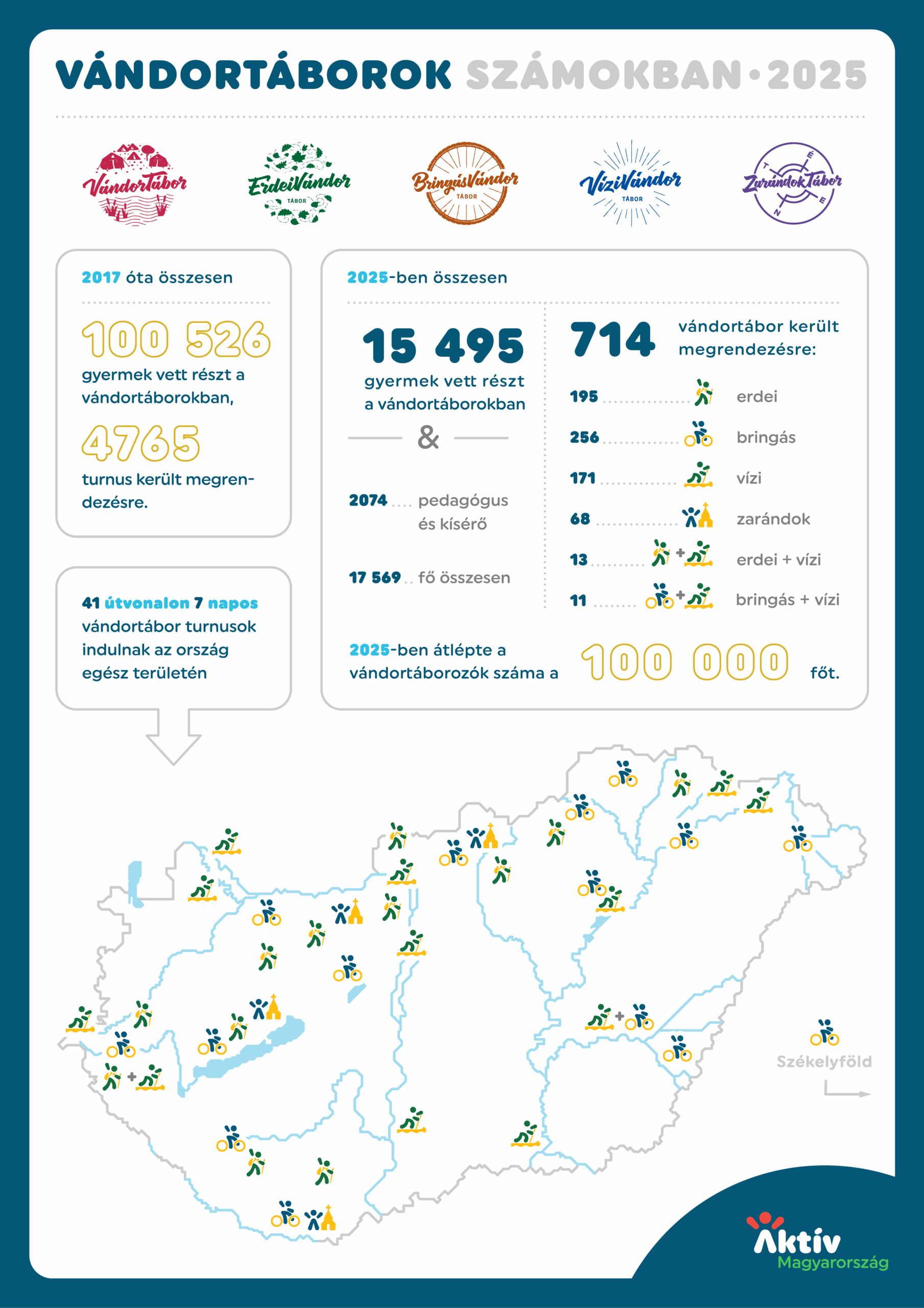 A Vándortábor Program új csúcsot ért el idén: 41 útvonalon, összesen 714 turnusban 15 495 gyermek járta be hazánk erdeit, hegyeit, vizeit és történelmi tájait.